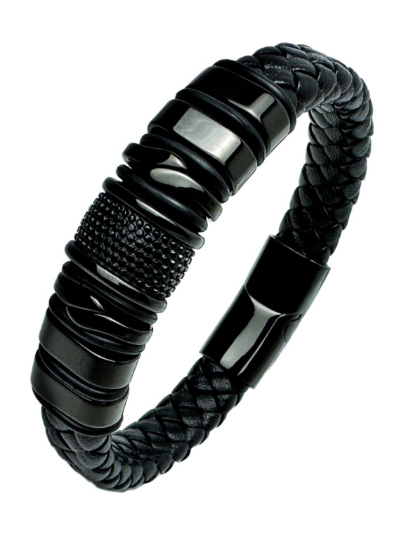 Bransoletka została wykonana ze skóry ekologicznej, przez co charakteryzuje się dużą trwałością i odpornością na uszkodzenia. Posiada ozdoby ze stali nierdzewnej oraz pleciony splot rzemykowy, dodający jej lekkości, a zarazem gwarantujący trwałość.