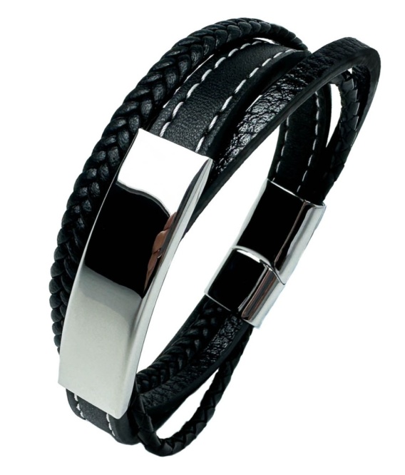 Czarna bransoletka rzemykowa wykonana ze skóry ekologicznej. Posiada eleganckie sploty rzemykowe - warkoczowe i proste, zdobienia ze stali nierdzewnej w srebrnym kolorze oraz białe efektowne szwy.